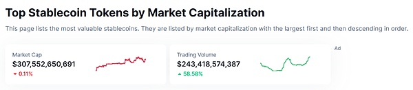 CoinMarketCap的数据显示,目前稳定币总供应量为3070亿美元,这巩固了稳定币作为加密领域增长最快的板块之一的地位。其他数据提供商也证实了这一上升趋势,尽管略有差异。