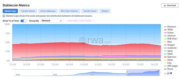 从公链分布来看,Tron链的稳定币份额遭遇了显著下滑,考虑到未来USDT和Plasma的紧密关系(USDT专属公链要发币!稳定币公链战役开启),Tron还有很大的下降空间。