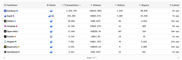 从下图数据看,Coinbase(@coinbase) 依然是最大Facilitator,处理交易超135万笔,覆盖8万买家;PayAI(@PayAINetwork) 居次位,在Solana和Base等链上活跃,累计28万美元交易额,用户数甚至超过Coinbase。其他如X402rs、Thirdweb(@thirdweb)、Open X402(@openx402) 等也在争夺市场份额。