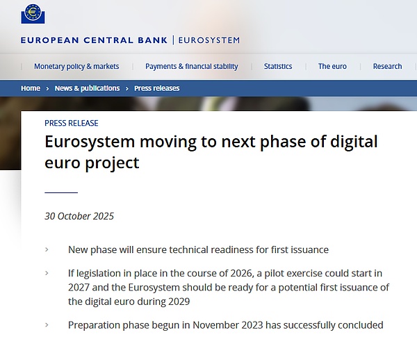 欧洲央行近日宣布,“数字欧元”项目进入下一阶段:如果相关法规在 2026 年通过,有望于 2027 年启动试点、2029 年正式发行。