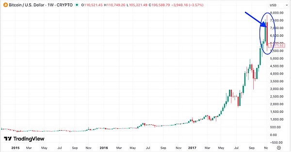 在此之前,BTC已经从2015年底部160刀左右一度攀升到了接近7860刀,涨幅达48倍。而仅仅11月初这一周时间,BTC就从7860刀的历史高位跌至最低5500刀,跌幅深达30%。