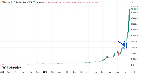 在此之后的短短5周时间,BTC连续快速拉出5根大阳线,从11月初的阴线低位5500刀,一鼓作气最高拉到了惊人的19800刀,涨幅高达260%。