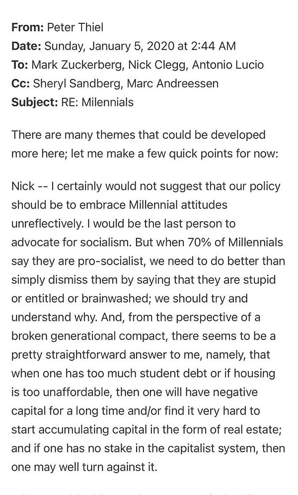在 2020 年一封写给 Mark Zuckerberg 的内部邮件中,Peter Thiel 写道: